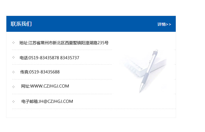 地址:常州市新北區友邦商務大廈1幢16、17層  電話:0519-85101652  傳真:0519-85112595  郵編:213022  網址:www_cz-jiayue_cn.an-goo.com  郵箱:xiajifengaa@163.com
